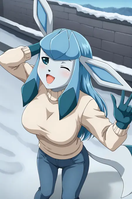 1girl, long hair, blue eyes, lanimal ears, blue hair, tail, sidelocks, colored skin, furry, colored sclera, green background, blue skin, furry female, body fur, white eyes,blue fur, furrification, blue sclera, glaceon, pokemon \(creature\)