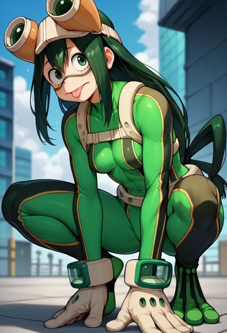My Hero Academia のツユ・アスイ。彼女のLORAはPonyXLベースのモデルで動作するように学習されていますので、標準的なプロンプトを使用してください:score_9, score_8_up, score_7_up, score_6_up, score_5_up, score_4_up