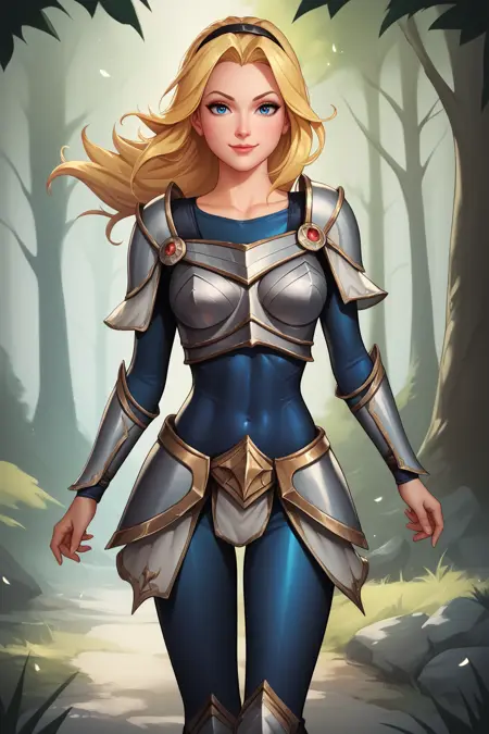 ➜ LuxLoLXL,蓝眼睛,金发,长发,黑色发带,中等胸部,锁骨,肩甲,盔甲,蓝色紧身衣,胸甲,长袖,护裙,短裙,蓝色长裤,盔甲靴,手持法杖