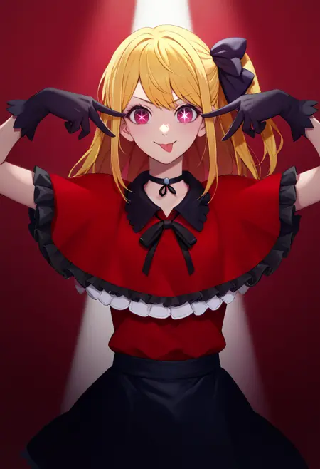 アイドル: rubyhoshidol, one side up, hair ribbon, black ribbon, mismatched pupils, star-shaped pupils, frills, red capelet, frilled capelet, red shirt, black bow, neck ribbon, black gloves, frilled gloves, black skirt, black choker
