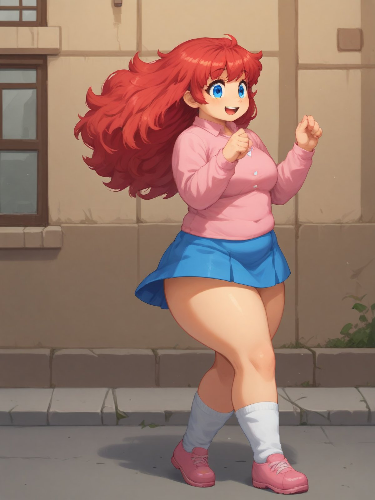 穿着 蓝色连衣裙、粉红色上衣、白色腰带、白色袜子、粉红色鞋子(AI可能交换颜色,如白色上衣,或改变位置,如上衣穿在裙子外面,使裙子看起来像短裙),但这只是副作用,只需继续生成或用Photoshop修正即可。