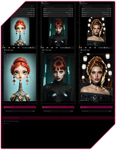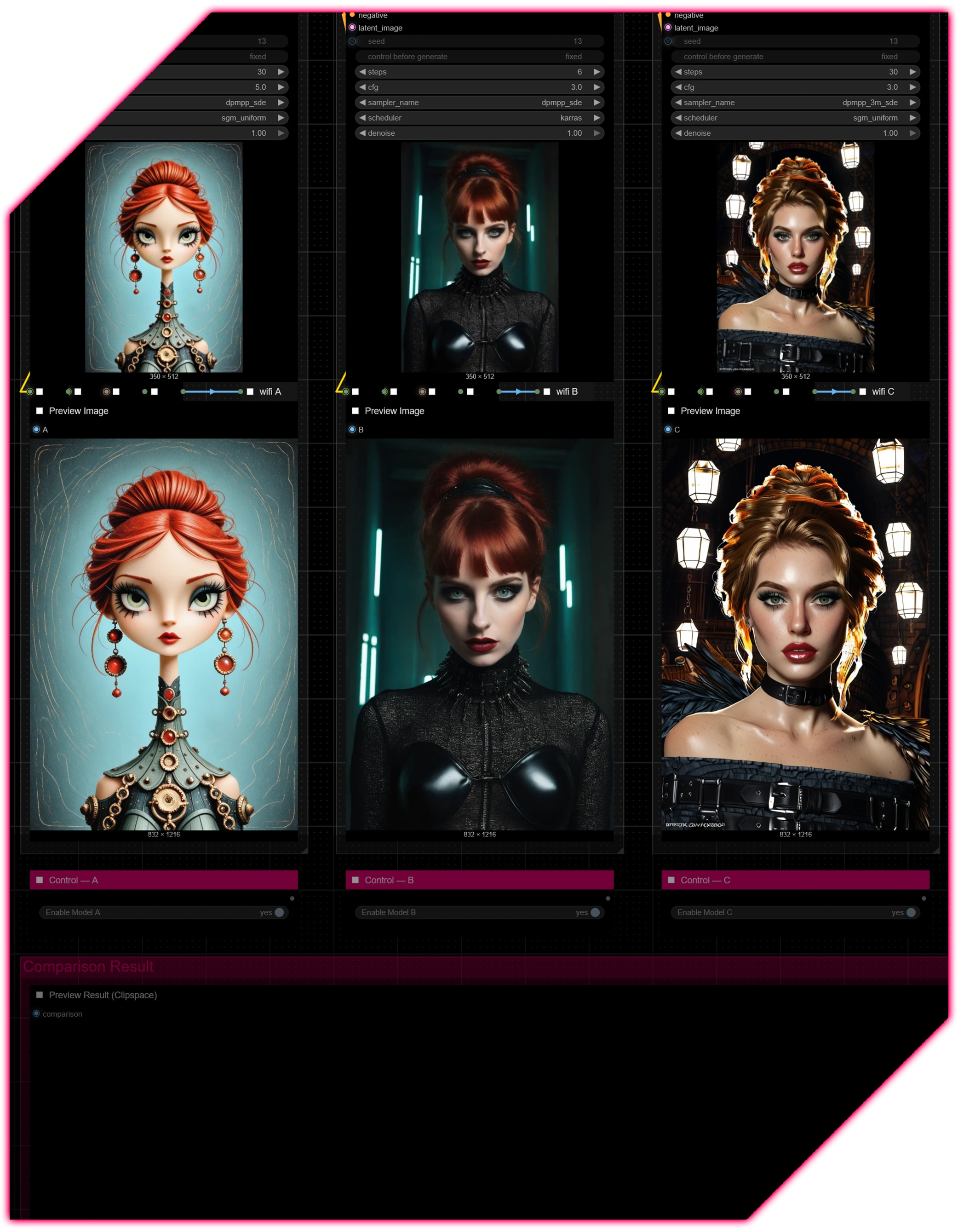 This workflow was built to compare checkpoints next to each other using the same seed and prompts, while allowing individual adjustments of all their individual parameters to help you find the checkpoint best suited for your needs**_!_**