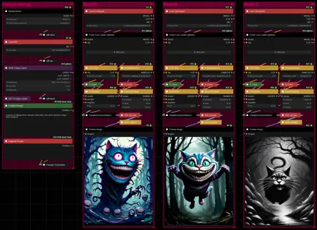 This workflow was built to compare checkpoints next to each other using the same seed and prompts, while allowing individual adjustments of all their individual parameters to help you find the checkpoint best suited for your needs**_!_**
