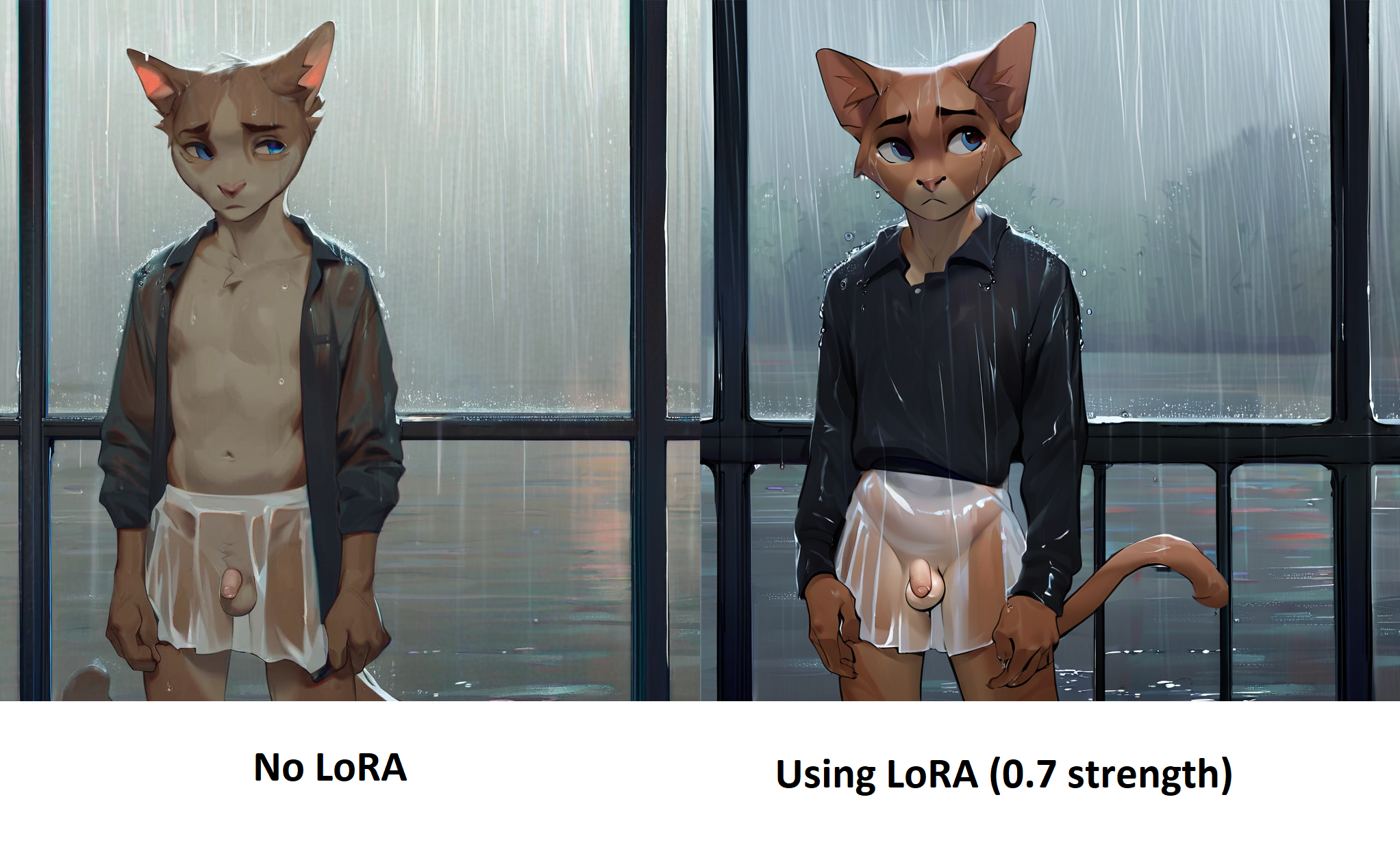 SupremeFurry 并非万能的“修复一切”LoRA。和任何其他 LoRA 或模型一样,你有时仍会得到不理想的结果。我们的目标是平均提升生成图像的质量。这种“图像更好了”的感觉是主观的,但客观而言,SupremeFurry 能将平庸的提示词转化为出色得多的作品,效果令人惊喜。