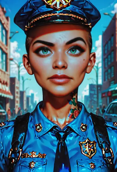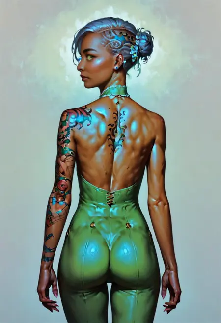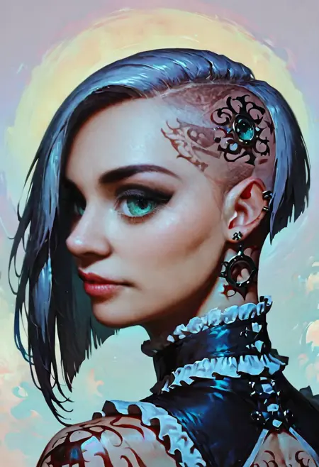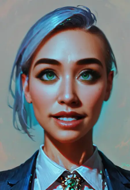 Reina’s features include: silver hair, an inverted bob, green eyes, tattoos, tan skin, and moles (add these features to the prompt for more accuracy).
