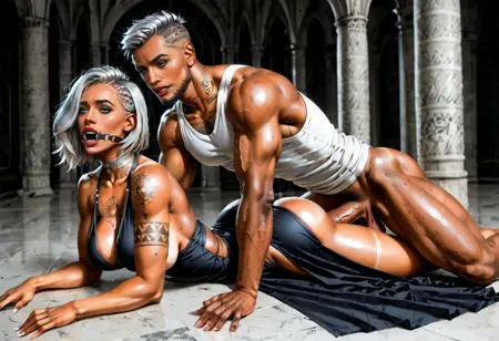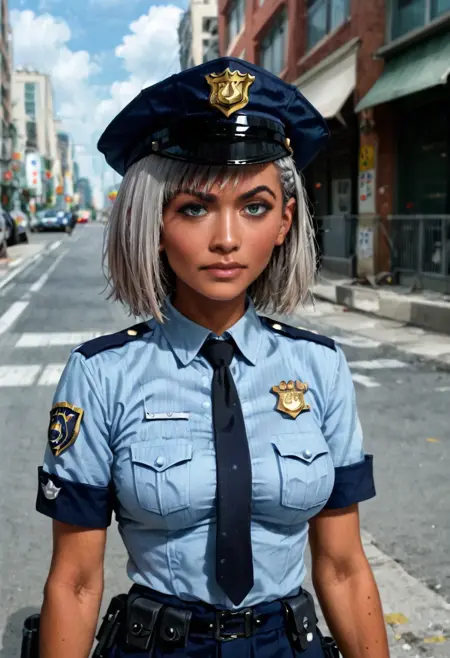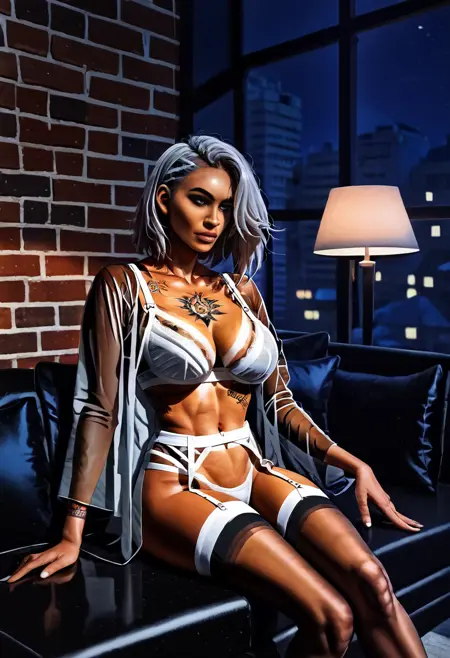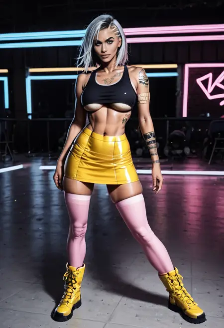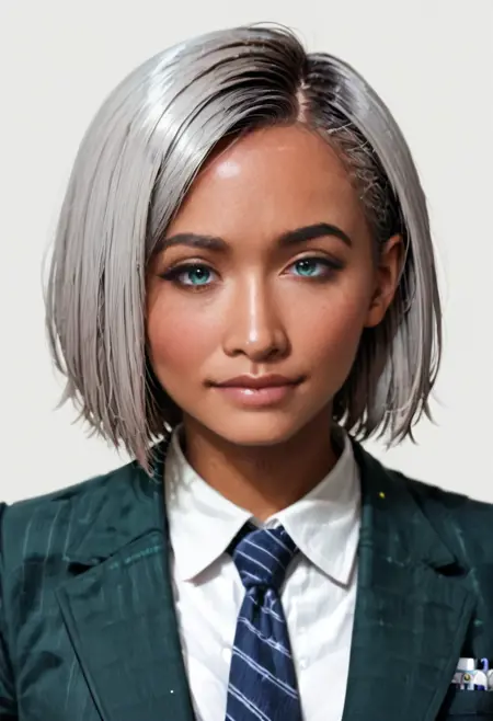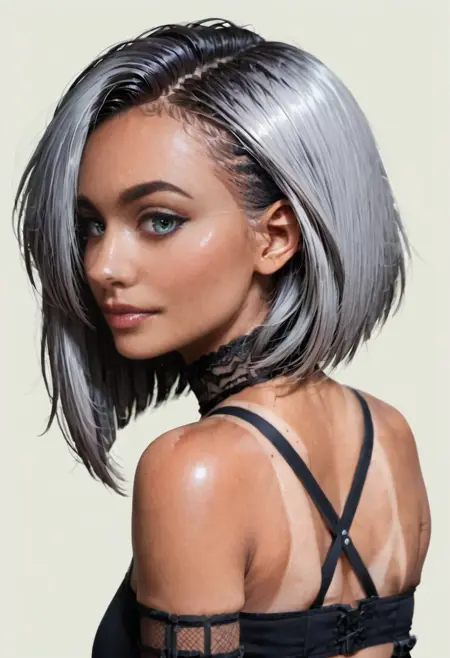 雷娜的 特征 包括:银色头发、倒置鲍勃头、绿色眼睛、纹身、古铜色皮肤以及痣(在提示中加入这些特征以获得更准确的效果)。