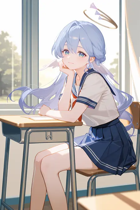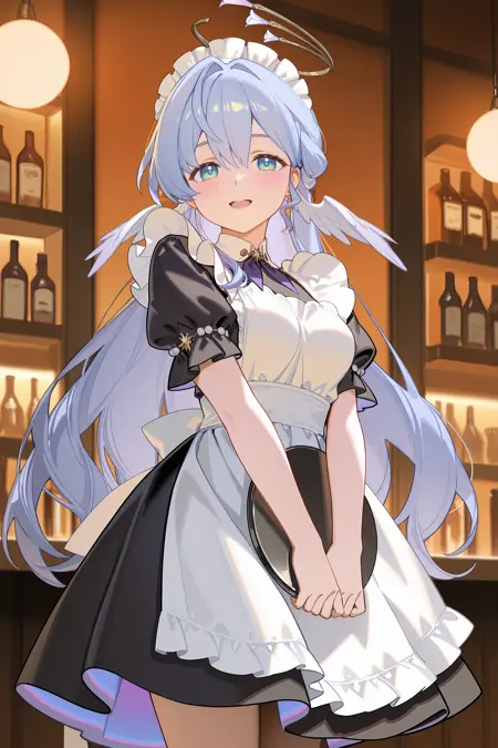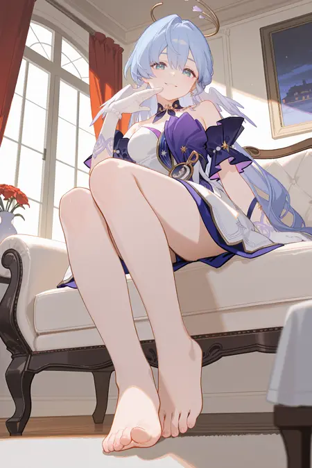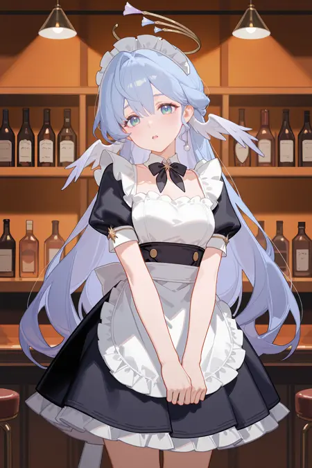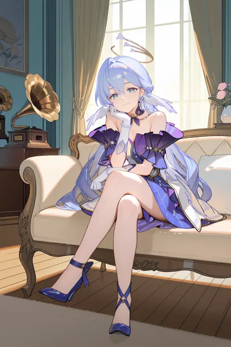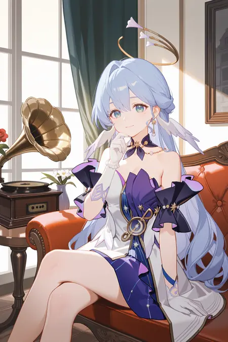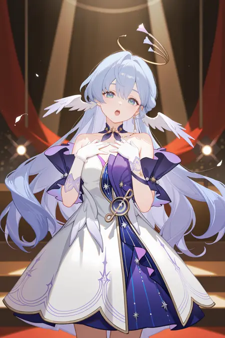 デフォルトの衣装用追加プロンプト:ノースリーブドレス、ハロー、白い手袋、青いパンプス、イヤリング、頭部の翼、分離された袖、分離されたカラー