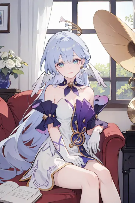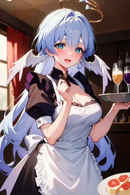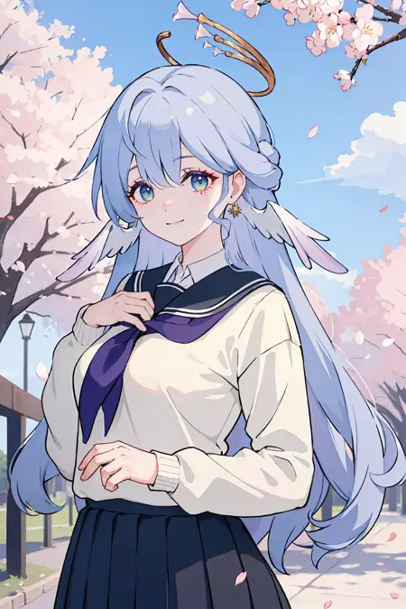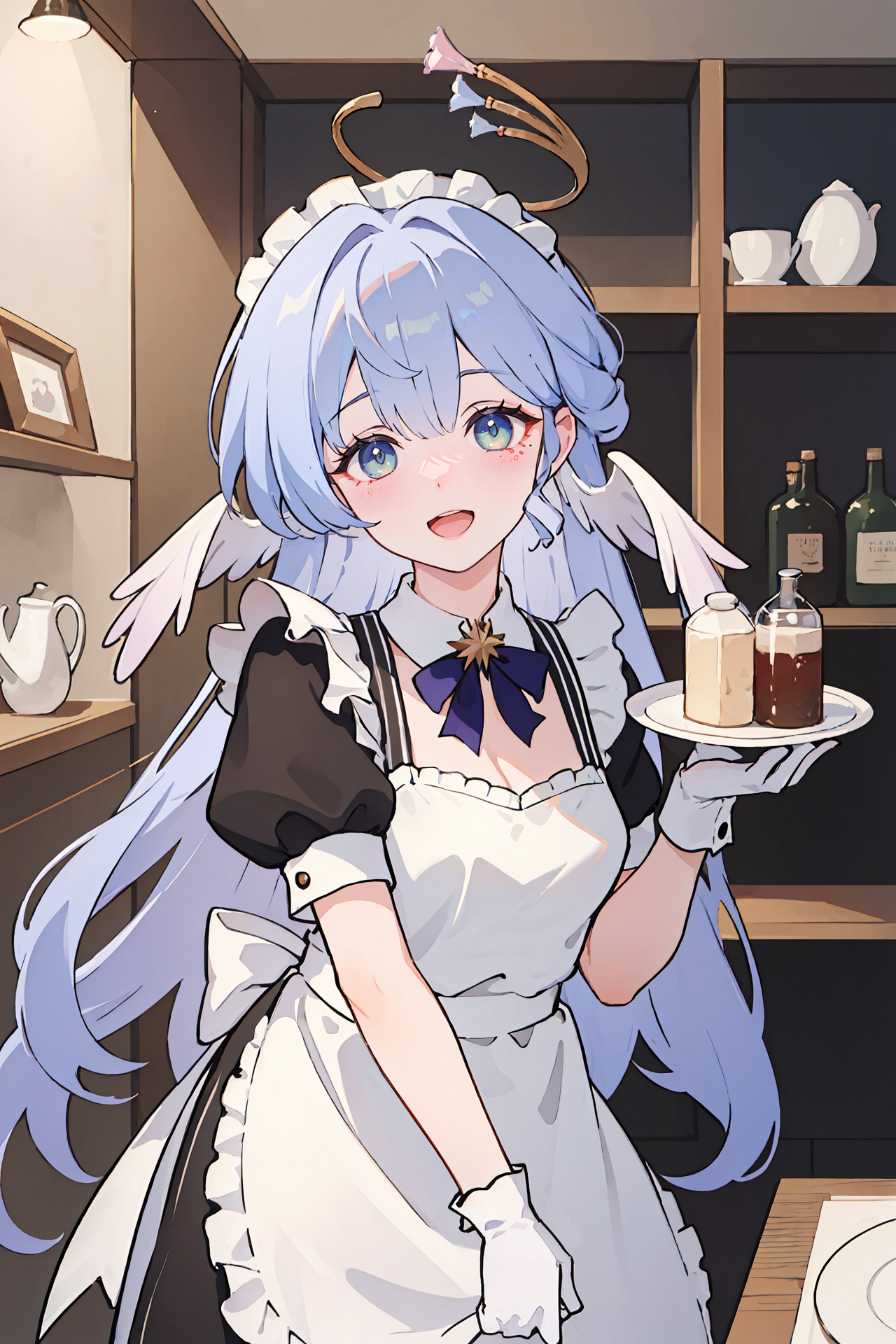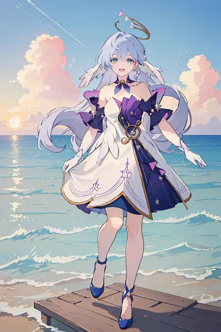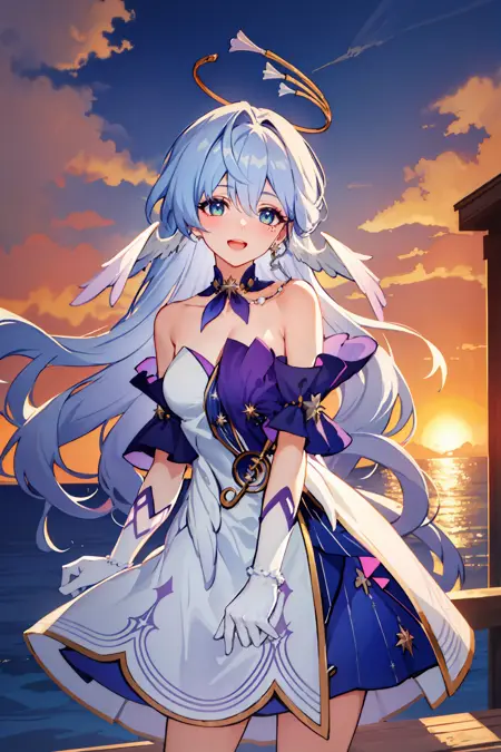 默认服装的附加提示:无袖连衣裙、光环、白色手套、蓝色高跟鞋、耳环、头翼、可拆卸袖子、可拆卸衣领