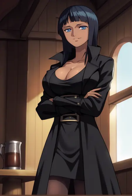strongworldsuit, black pantyhose, long coat, black coat, long sleeves, trench coat, open coat, high collar, black dress, waistband, cleavage,