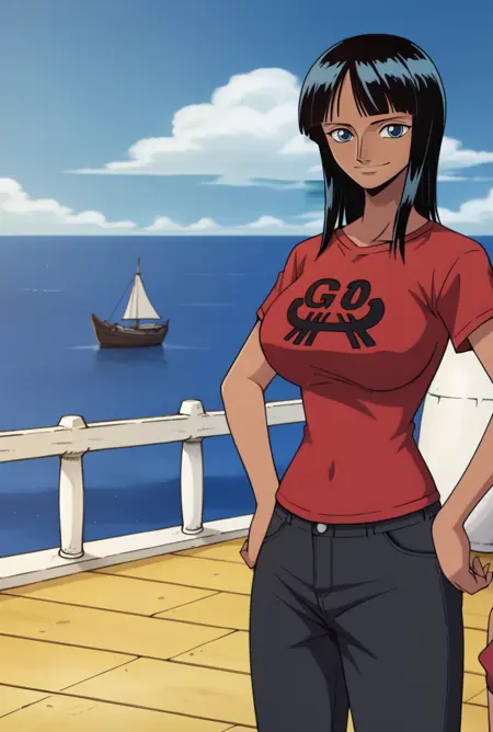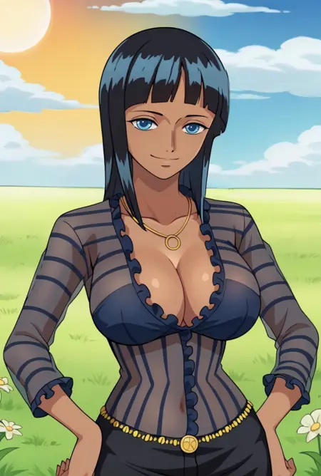 strongworldcas, jewelry, necklace, black pants, blue shirt, striped shirt, frills, loose clothes, no bra, cleavage, see-through, belly chain,