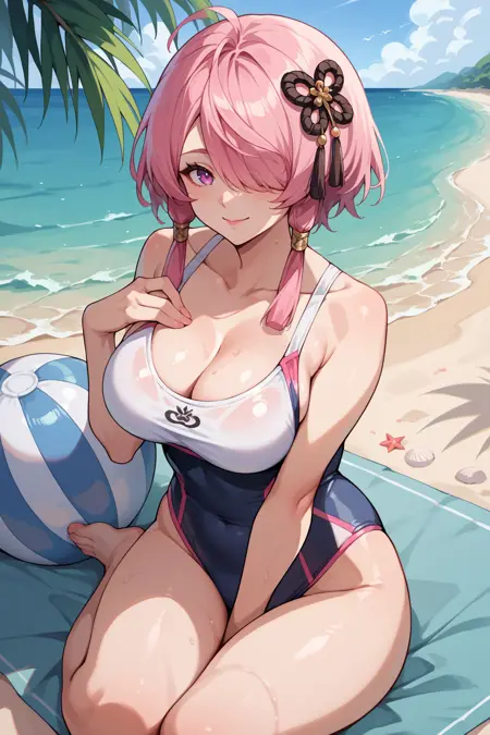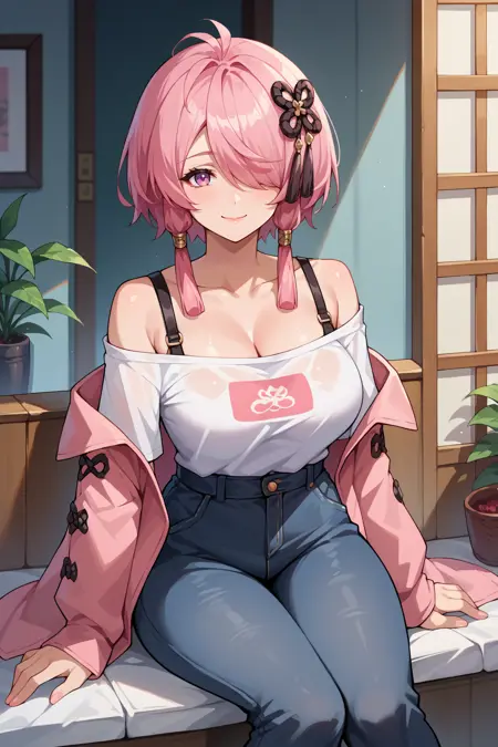 必须包含的提示词:“陶琪,粉发,粉眼,头发遮住一只眼睛”,“流苏,发饰”非必需