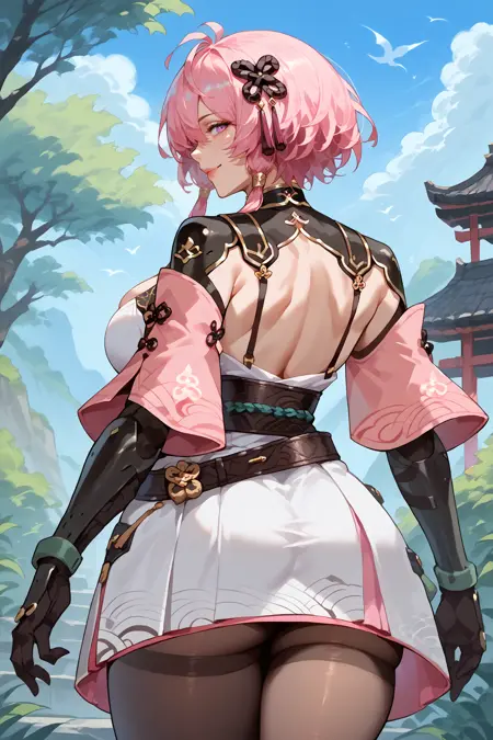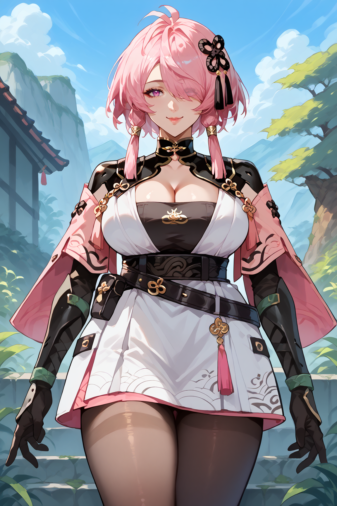 她的默认服装:“短裙,露胸,腰带,手套,分离袖子,头发遮住一只眼睛,护臂,肩甲”