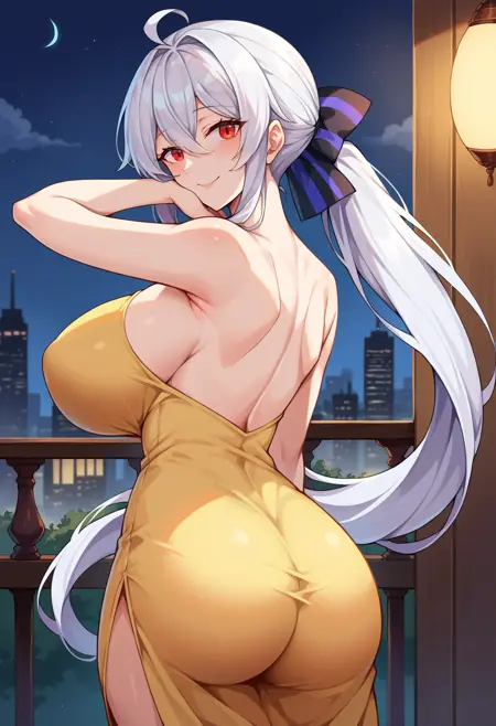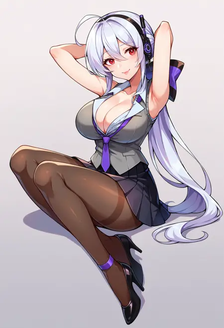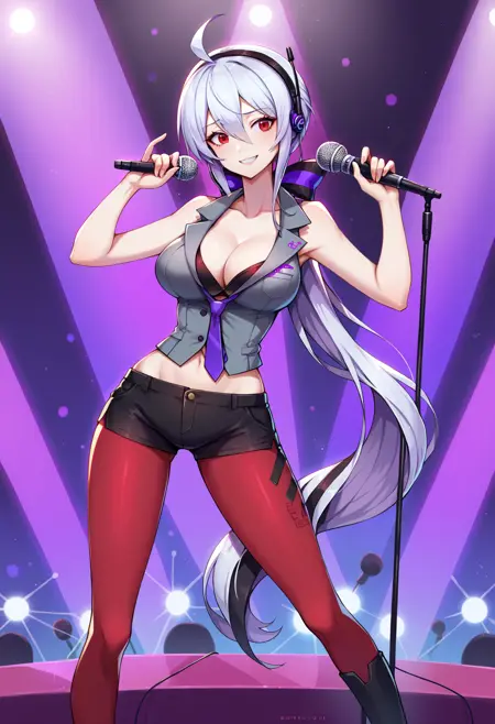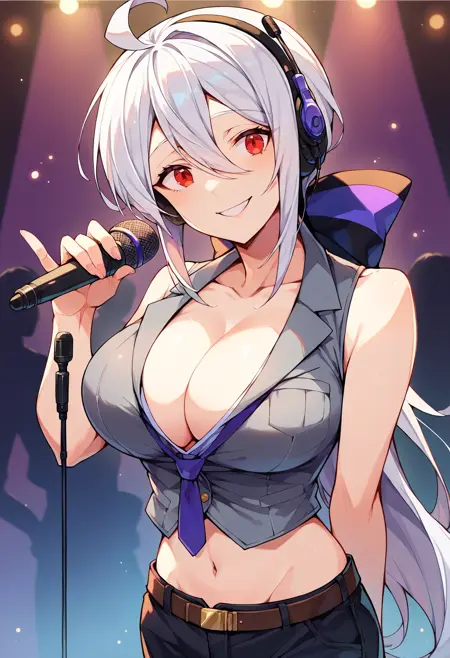 Base Outfit: ywhakubase, detached sleeves, large breasts, ponytail, red eyes, sidelocks, silver hair, striped ribbon, very long hair, hair bow, headset, smile, grey vest, ahoge, purple tie, midriff, black pants, belt,