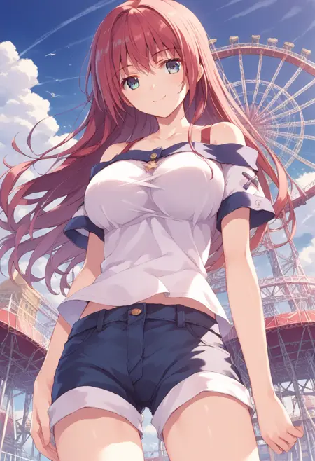 ロングヘア: ライカ・ミサキ、赤髪、ロングヘア、大きい胸、短袖、肩出し、ショートパンツ、片方のスリーブレッグ、