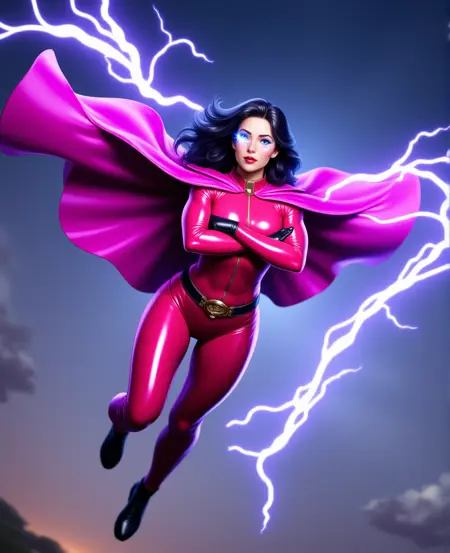 空を飛びながら岩を投げるスーパーヒーロー女性、彼女の周りには強力で光り輝き脅威的なオーラが漂っている、リアリスティック、1girl、下から、青ラテックスボディスーツ、黒チョーカー、黒ネイル、黒く塗った唇、黒目、紫髪