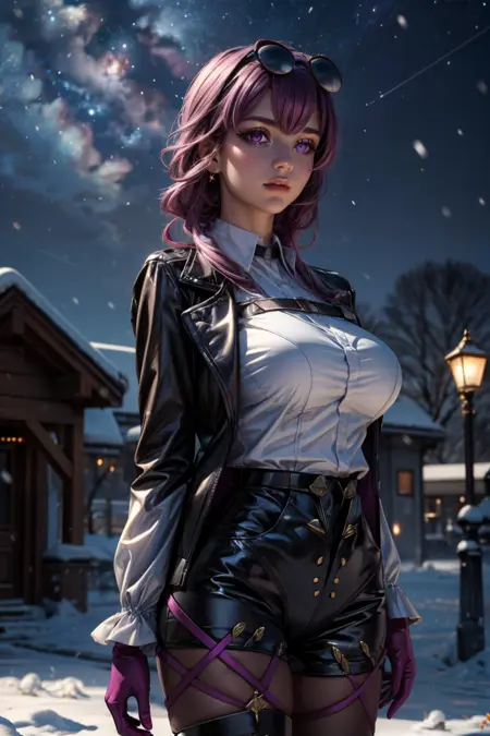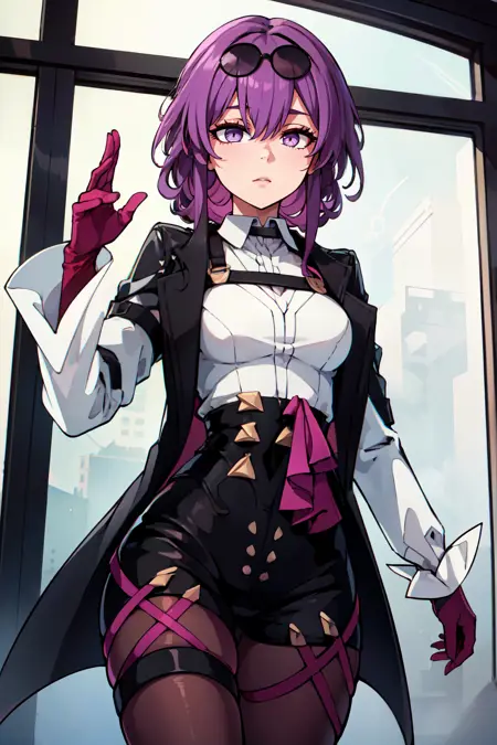 追加タグ: zzKafka, purple_hair, purple_eyes, sunglasses, eyewear on head, harness, black jacket, white shirt, collared shirt, long sleeves, white sleeves, purple gloves, black shorts, thigh strap, pantyhose,
