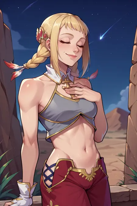Revenant Wings 외모를 원할 경우 "revPenelo, blonde hair, brown eyes, twin braids, hair ornament, grey crop top, detached collar, midriff, red pants, gloves"를 추가하세요.