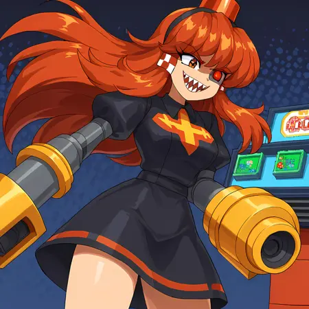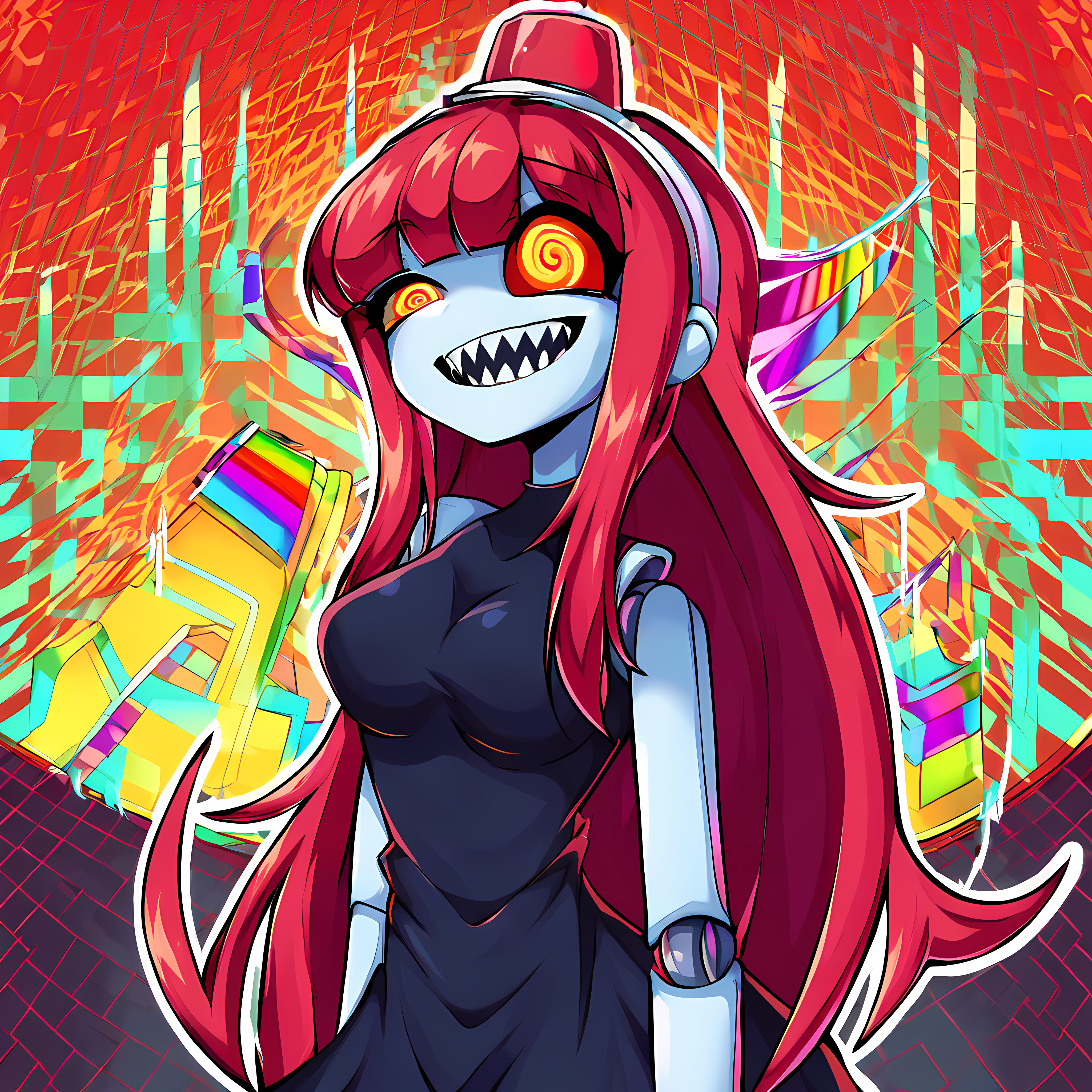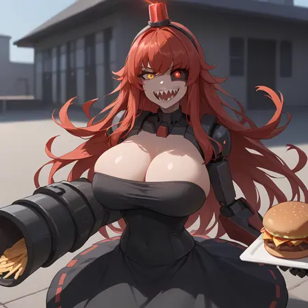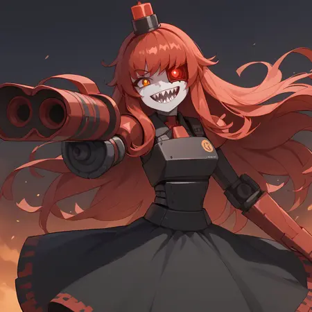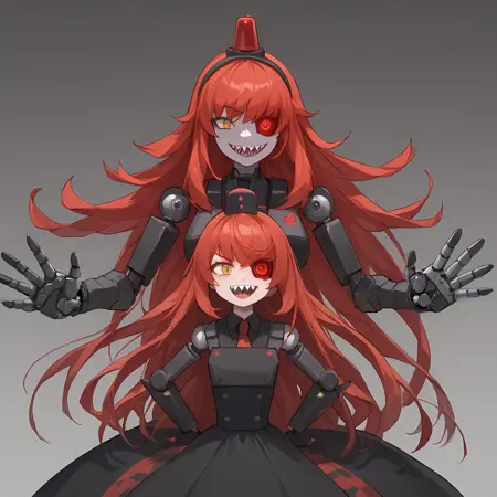 추천 태그: 인간화, 오리지널, 1girl, 경보 사이렌, 검은 드레스, 빨간 머리, 긴 머리, 머리장식, 날카로운 이빨