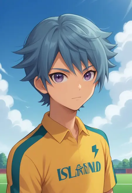 HiuraKirina, 1boy, male focus, solo, purple eyes, blue hair, orion soccer uniform, shirt, blue shirt, raglan sleeves, short sleeves, shorts, blue shorts, socks, blue socks, shoes, sneakers,