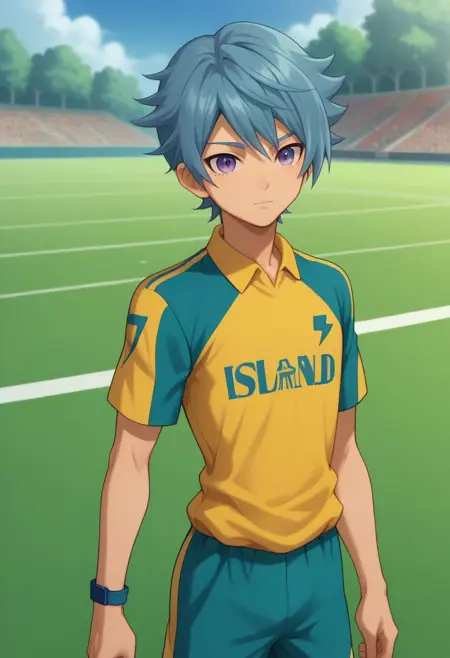 HiuraKirina, 1boy, male focus, solo, purple eyes, blue hair, inakumi soccer uniform, shirt, yellow shirt, short sleeves, bracelet, shorts, aqua shorts, socks, aqua socks, shoes, sneakers
