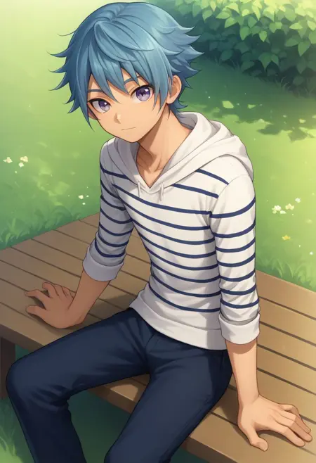 HiuraKirina, 1boy, male focus, solo, purple eyes, blue hair, hoodie, white hoodie, hood, striped hoodie, pants, black pants, capri pants,