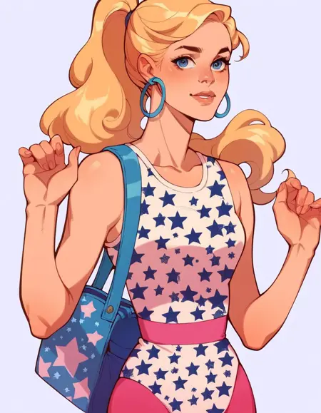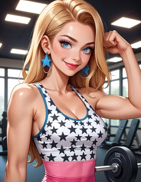Keywords: hud_b4rb, sleeveless leotard, pink leggings, star print, blue hoop earrings