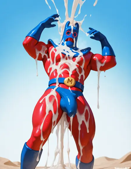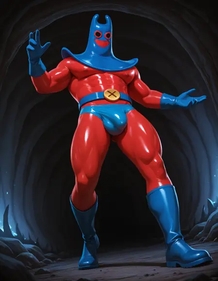 - red bodysuit, blue gloves, blue underwear, belt, mask, muscular, tight clothing