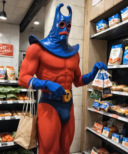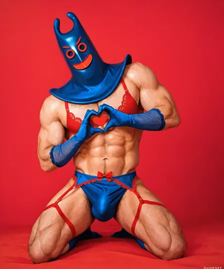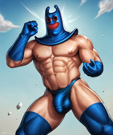 - red bodysuit, blue gloves, blue underwear, belt, mask, muscular, tight clothing