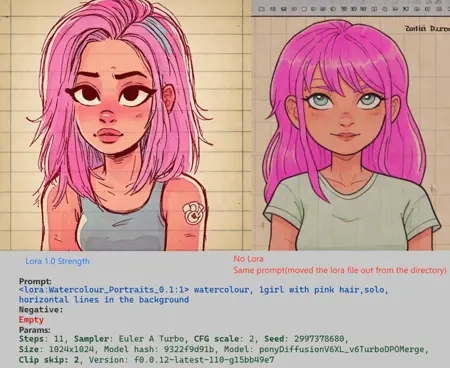 トリガー語: このLoRAにはトリガー語は不要です。プロンプトを強化したい場合は「watercolor」を追加してください ;)