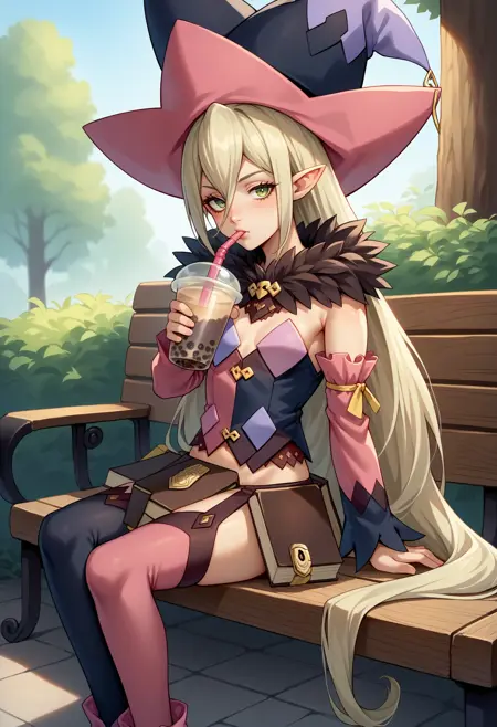 Magilou, pointy ears, very long hair, hair between eyes, witch hat, fur collar, multicolored vest, strapless, detached sleeves, mismatched sleeves, book skirt, asymmetrical legwear, thighhighs, garter straps, mismatched footwear