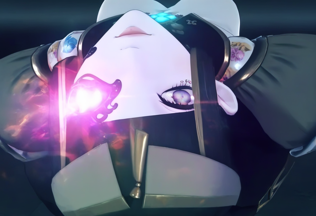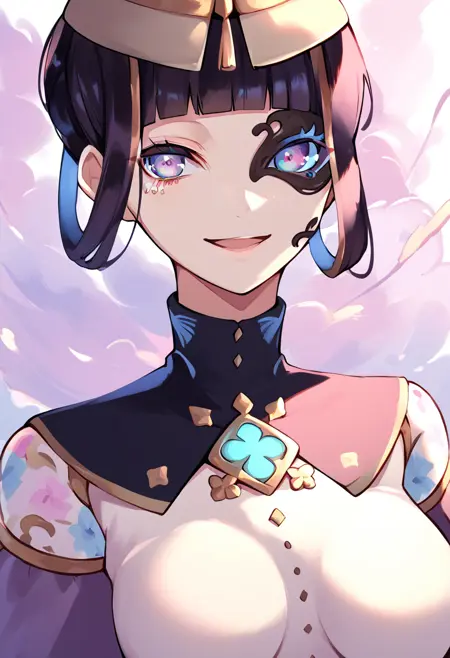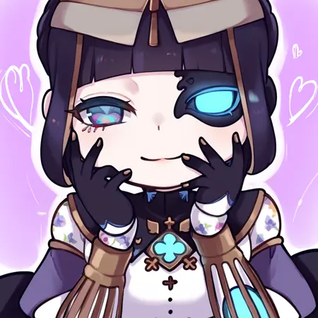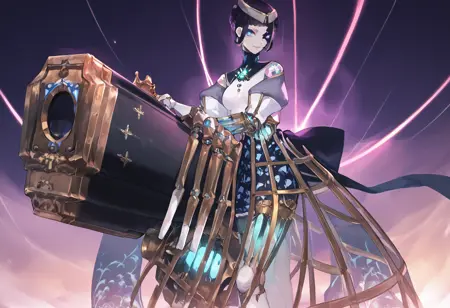 Tags (clothes): , eyepatch, gold metal waist cape, white mechanical legs, black back bow, black puffy short sleeves, no nipples