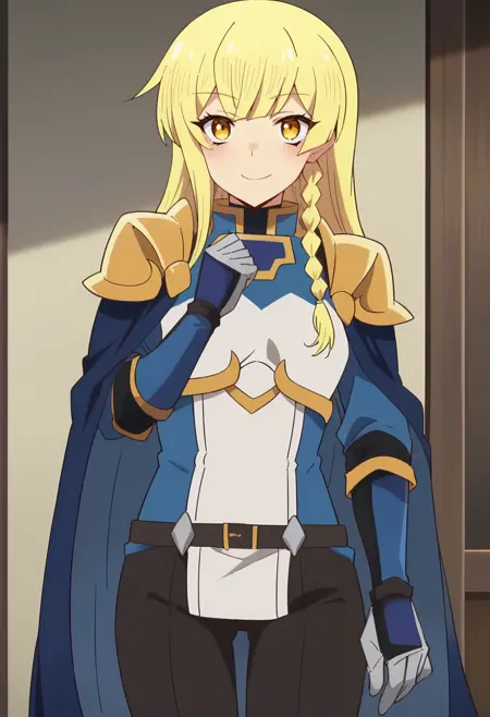 衣装1:胸当て、青色のマント、騎士、肩装甲、剣鞘、ベルト、黒パンツ、白手袋、パウルドロン