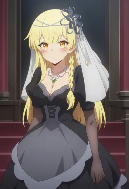 衣装4:胸元の露出、ドレス、ジュエリー、ネックレス、ふくらはぎ袖、黒いドレス、髪飾り、ジュリエット袖、宝石、短袖、ふくらはぎ短袖、髪の花、肘まで手袋、ベール
