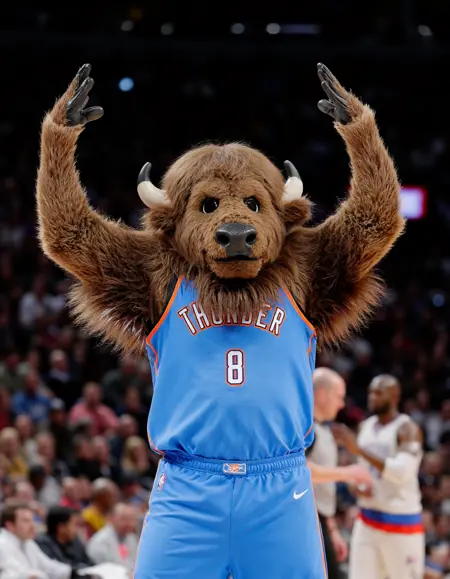 バイソンの頭を持つ男性のマスコットの写真。長い茶色の毛皮、鋭い角、鼻先を持ち、胸にオレンジ色で「thunder」と書かれた明るい青いバスケットボールジャージを着用。観客で満員の活気ある屋内スタジアムに立って両腕を上げている。アリーナの照明でジャージが輝き、観客と床は薄暗く照らされている、スポーツマスコットスタイルで