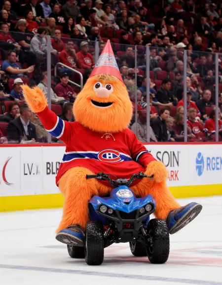 モントリオールのホッケーチームYuppiのスポーツマスコットの写真:オレンジ色の毛皮を持ちアイスリンクに立つ生物、非常に大きく大きな頭、小さな体、背景に観客