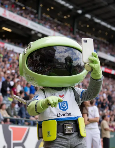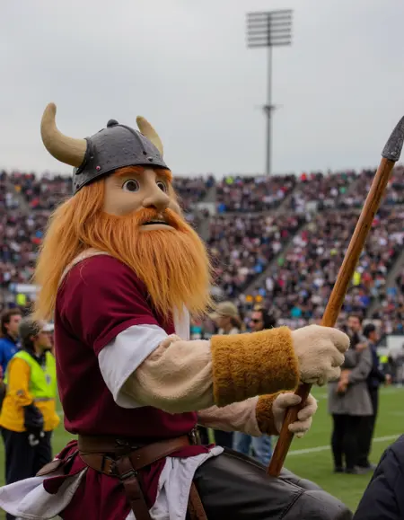 スポーツマスコットの写真、'your prompt'、非常に大きく大きな頭、小さな体、背景に観客