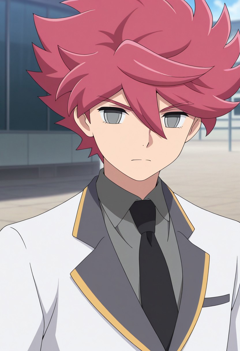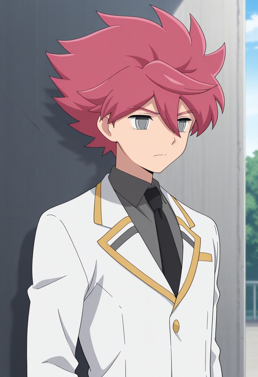 NosakaYuuma, 1boy, male focus, solo, grey eyes, pink hair, spiked hair, school uniform, shirt, grey shirt, collared shirt, necktie, black necktie, jacket, white jacket, blazer,