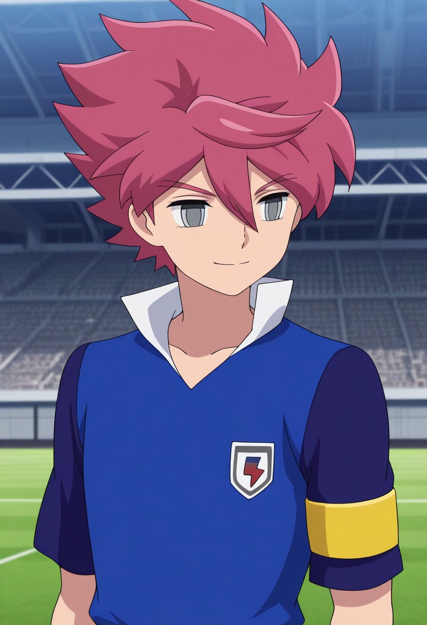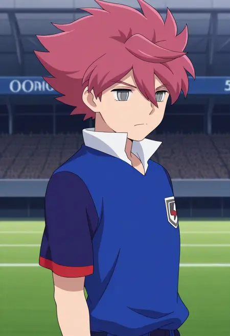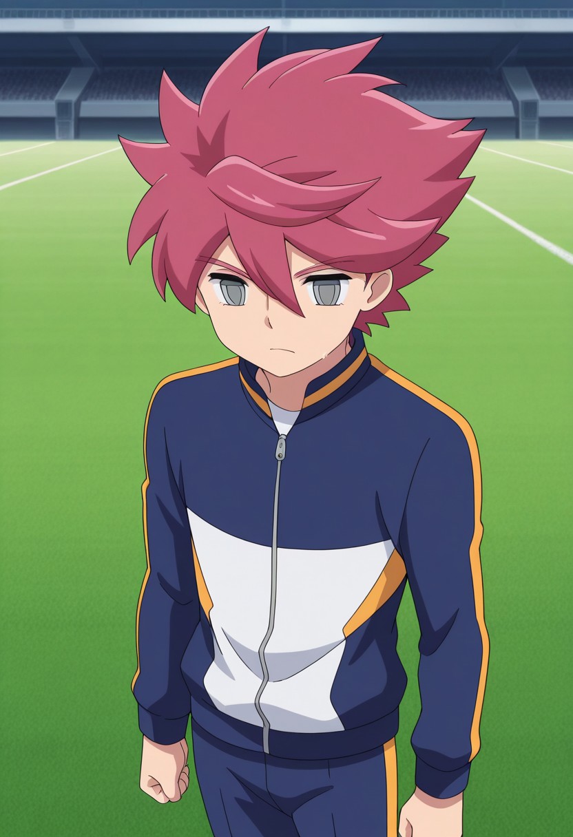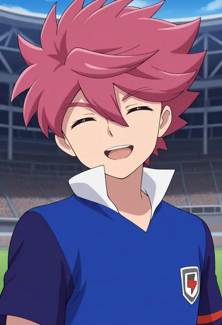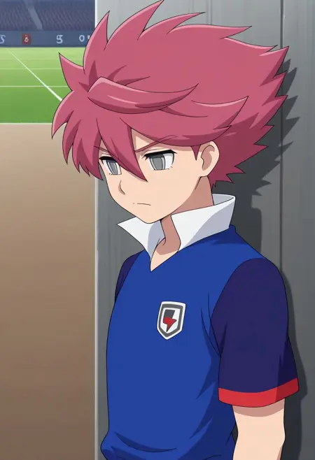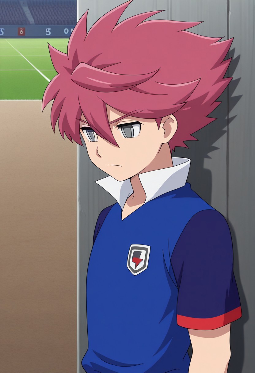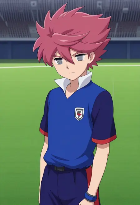 NosakaYuuma, 1boy, male focus, solo, grey eyes, pink hair, spiked hair, orion soccer uniform, shirt, blue shirt, popped collar, raglan sleeves, short sleeves, shorts, blue shorts, socks, blue socks, shoes, sneakers,