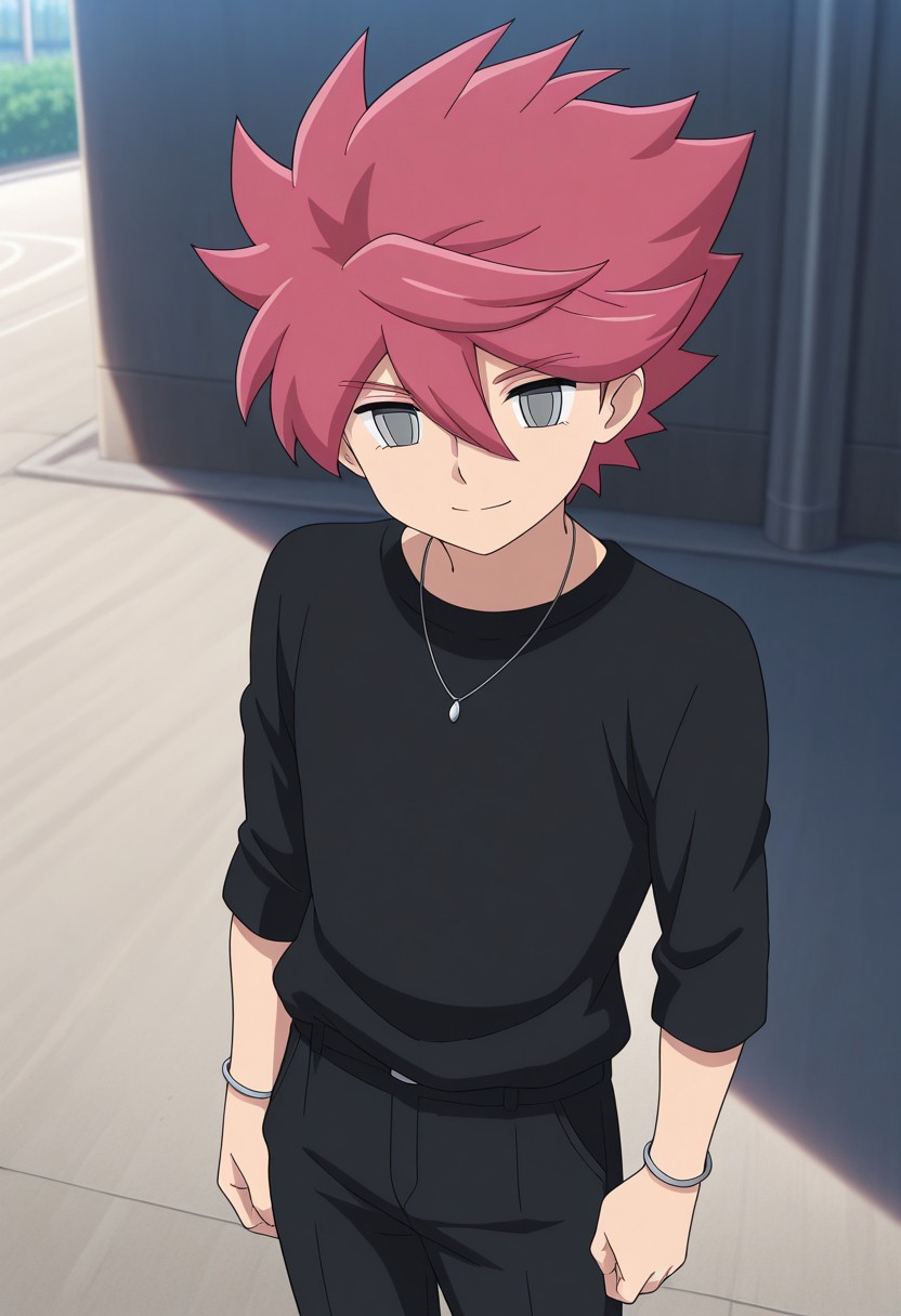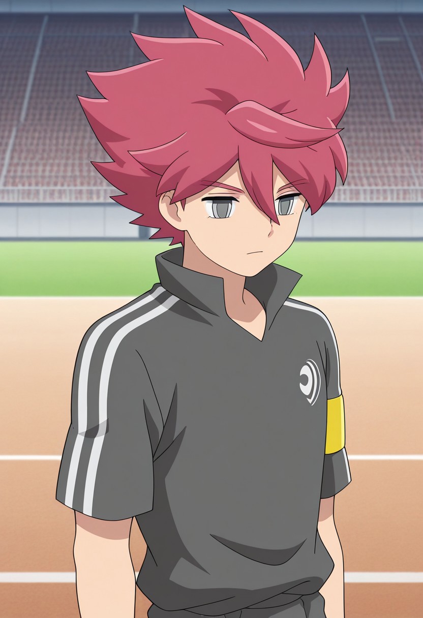 NosakaYuuma, 1boy, male focus, solo, grey eyes, pink hair, spiked hair, gekko soccer uniform, shirt, grey shirt, popped collar, short sleeves, armband, bracelet, shorts, white shorts, socks, grey socks, shoes, sneakers,