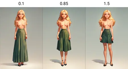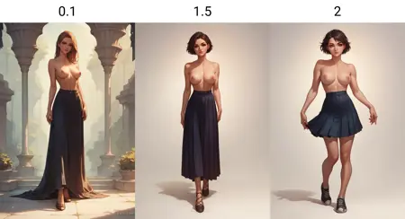 Slider for adjusting Skirt length, also works with some dresses. images seem to change a lot, I am not used to train LoRAs for anime, you will probably get better results than me as I don't have a lot of experience on anime myself. But I saw there was a question on my Pony version here: Skimpify Slider.