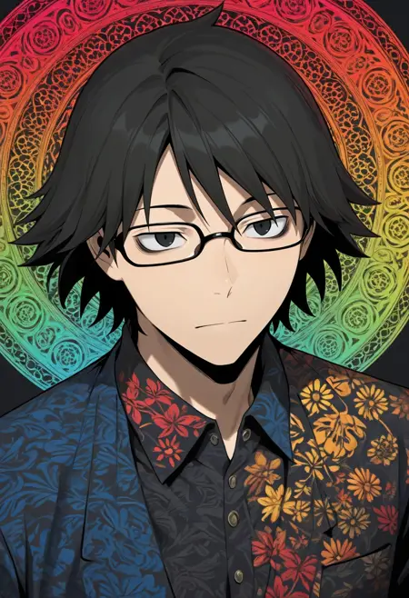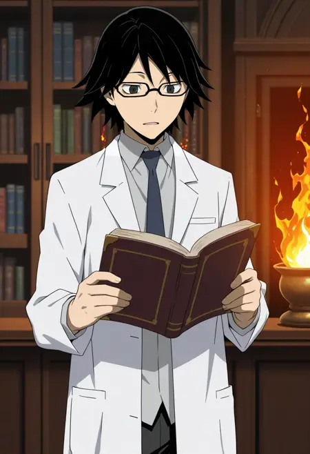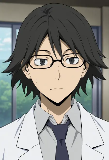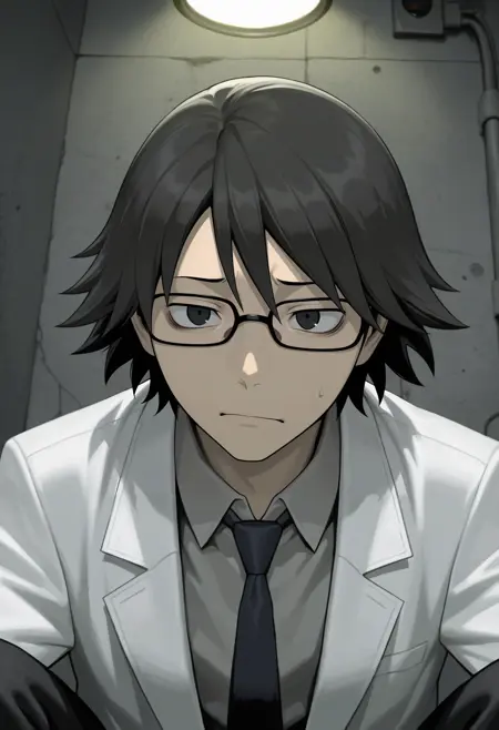 用于示例图像的动态提示:shinra_kishitani,黑发,黑眼,眼镜,{灰色衬衫,有领衬衫,白色实验服||}