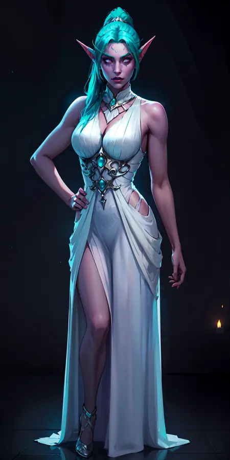 Classic outfit: aqua hair, glowing eyes, white dress