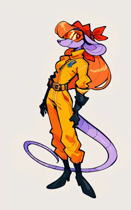For her Outfit 2: gloves, bandana, orange visor, orange hair, black gloves,yellow jumpsuit,belt