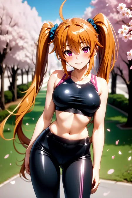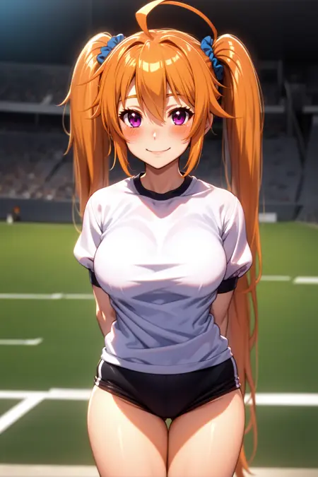 appearance: irina, purple eyes, orange hair, long hair, ahoge, hair scrunchie, twintails