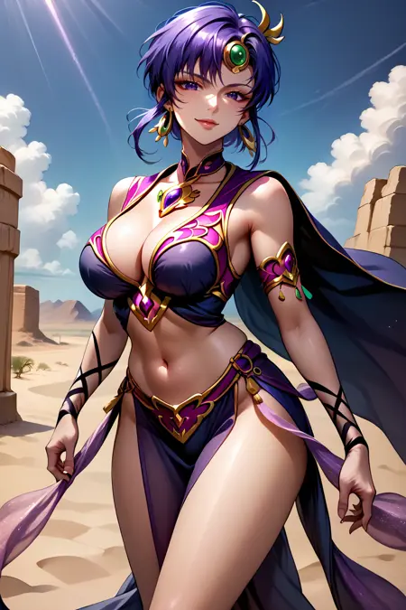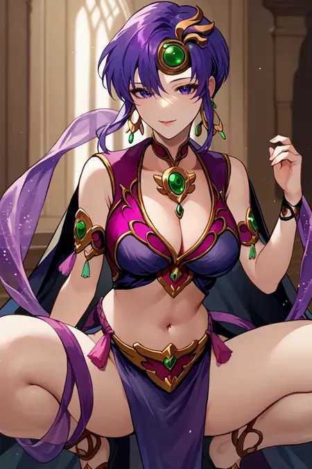 카데인 우르살라에는 "khaUrsula, 보라색 머리, 보라색 눈, 머리 장식, 귀걸이, 목걸이, 보라색 망토, 보라색 어깨 없음 상의, 가슴 노출, 복부, 팔찌, 보라색 치마, 골반 커튼, 무희복"을 추가하세요.