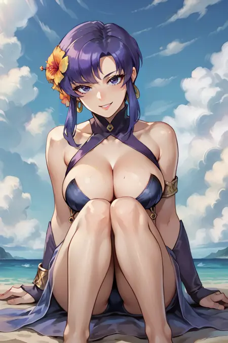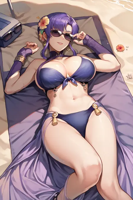 여름 우르살라에는 "sumUrsula, 보라색 머리, 보라색 눈, 머리 장식, 귀걸이, 보라색 비키니, 수영복, 보라색 장갑, 투명한 사롱"을 추가하세요.
