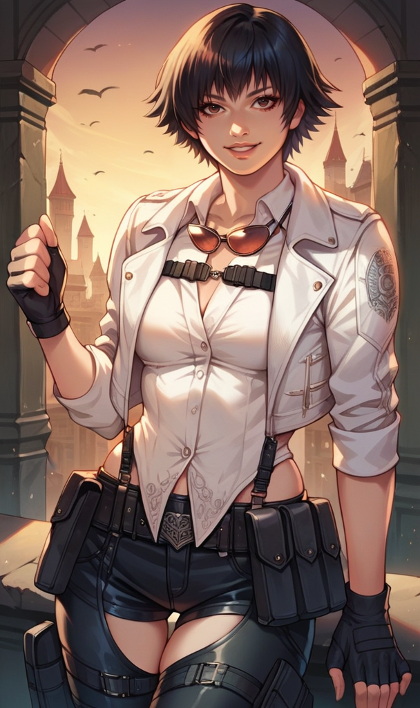 LadyDMC5、短くカットしたジャケット、白いシャツ、指なし手袋、首にかけられた眼鏡、太もも切り替え、太もも間、短い髪」と入力して彼女の衣装を生成