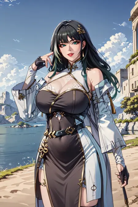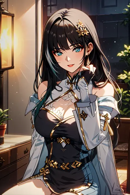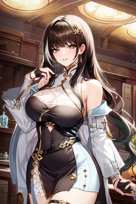 彼女のデフォルトの衣装:「髪飾り、中国風ドレス、胸元開き、肩出し、ベルト、フィンガーレスグローブ、外れ袖、太ももストラップ」