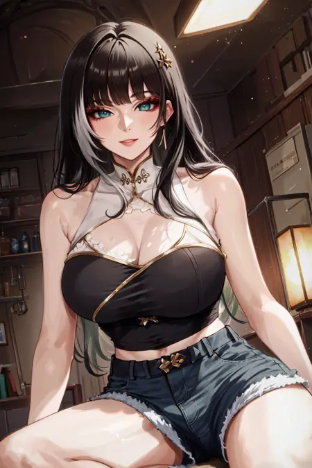 「バイジー、黒髪、緑色の目、白髪、ストライプ髪、非常に長い髪」は必須プロンプトです。髪の詳細をさらに加えたい場合は「緑髪、グラデーション髪」を推奨します。