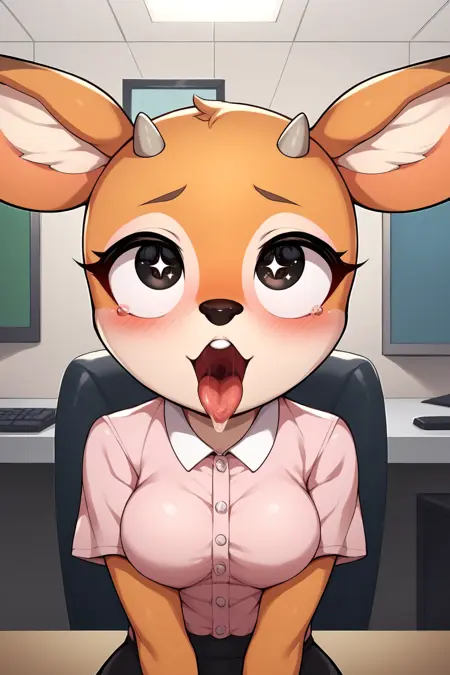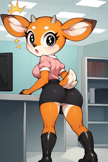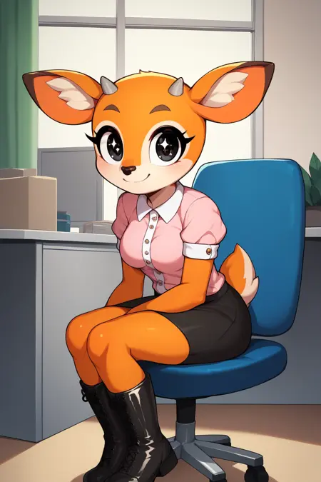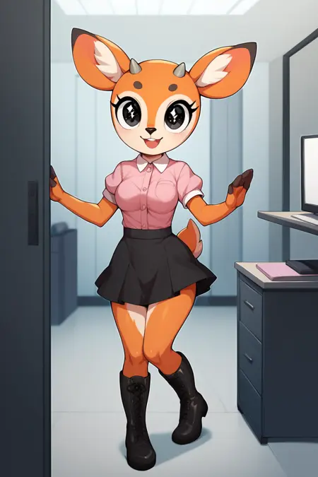 ➜ TsunodaAOXL, アンスロフォーリー, ファーリー女性, オレンジ色の毛皮, 二色毛皮, 大きな目, 黒い目, 煌めく目, 鼻先, 鹿の耳, グレーの短い角, 尾, 中程度の胸, ピンクのブラウス, 短い袖, 黒いスカート, 黒いブーツ